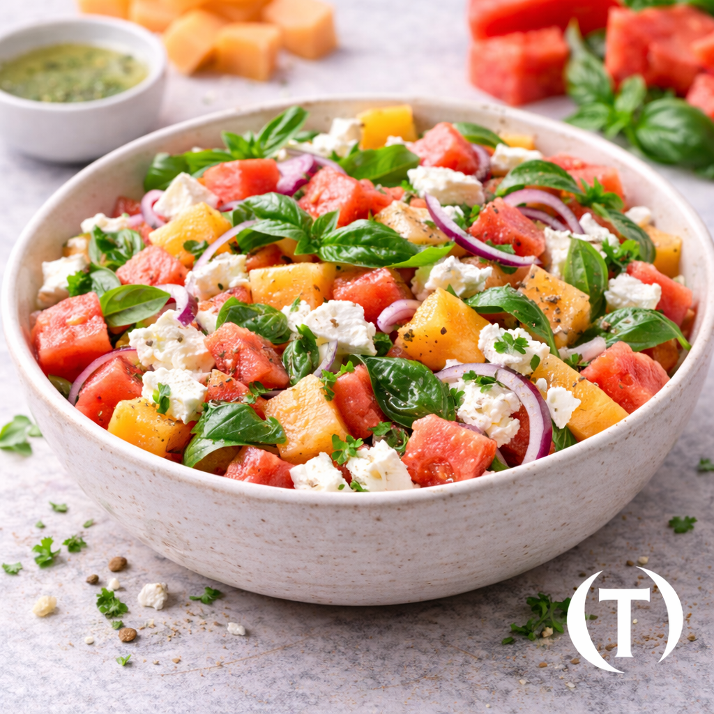 LA FRAICHEUR D’ETE – Pastèque, melon, feta, basilic, oignons rouge feta et sauce à part
